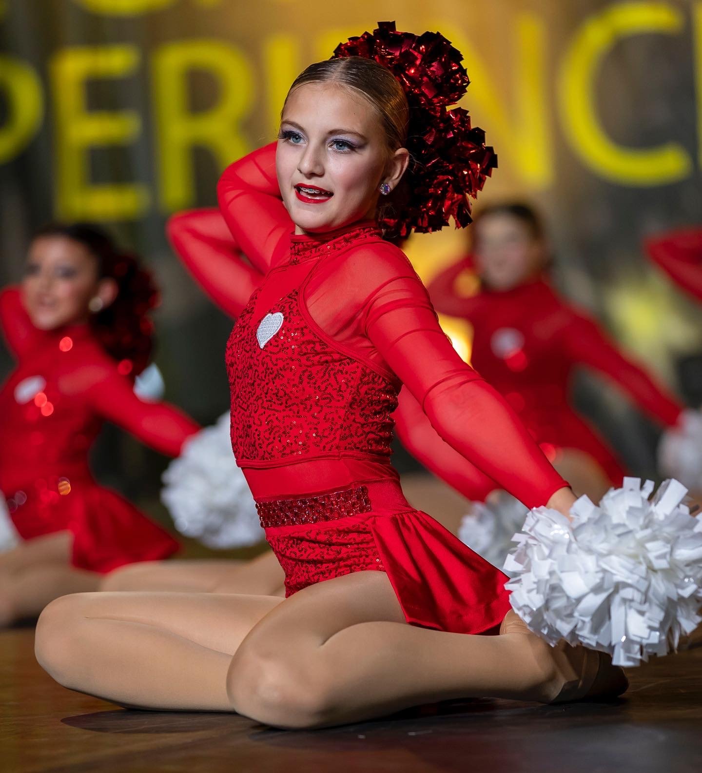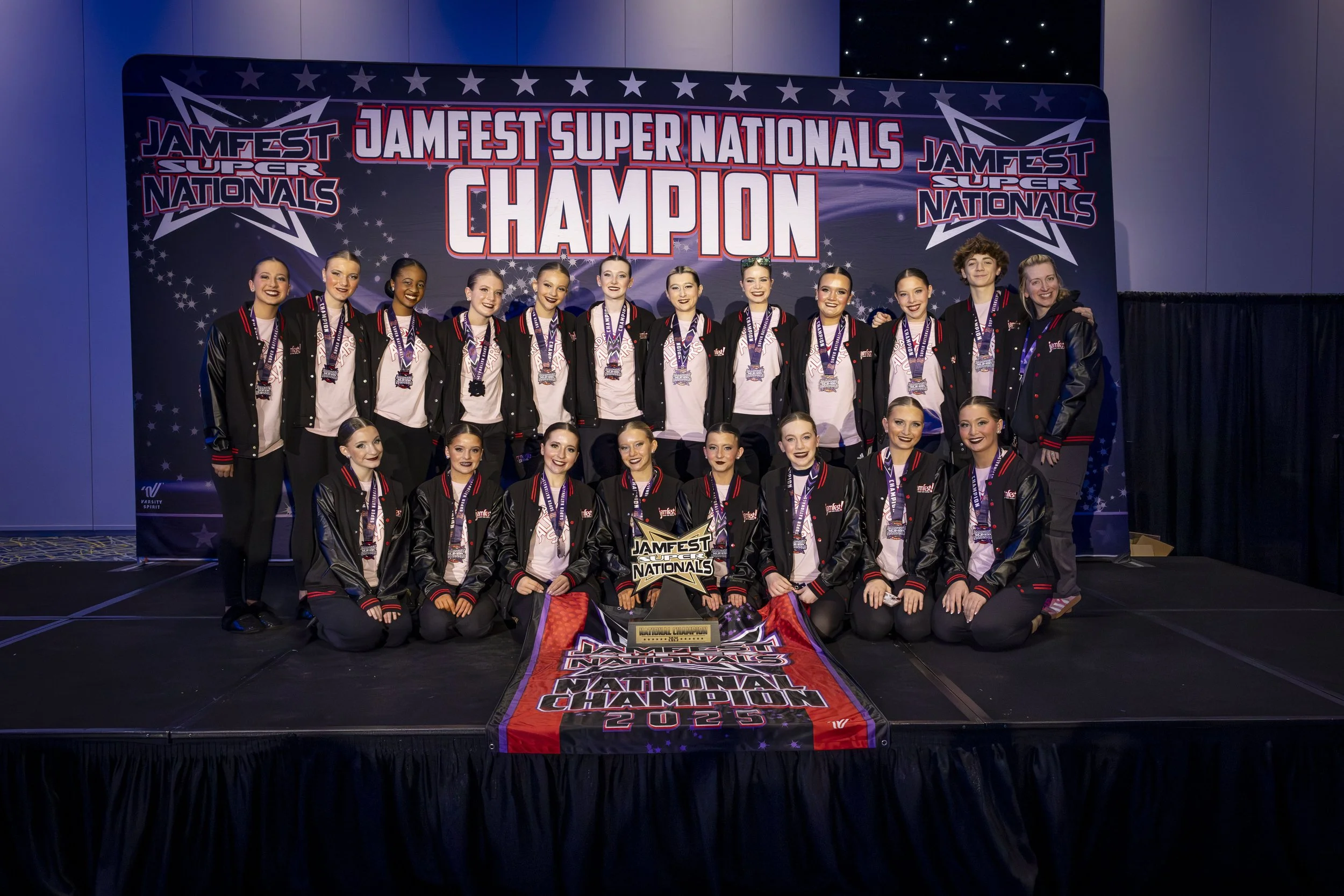 Group of young girls in black jackets with red accents, red bows, and medals posing with a trophy at a dance competition, with a backdrop and a banner on the floor that reads 'Jamfest Super Nationals 2023'.