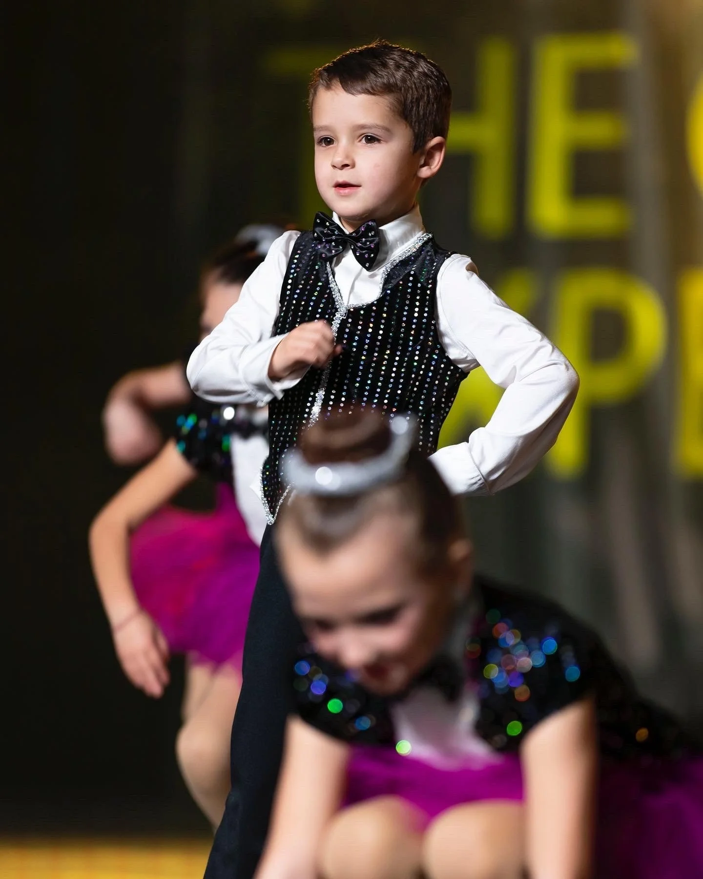 A large group of young dancers on a stage during a performance or rehearsal, dressed in colorful costumes, with a backdrop featuring a rainbow of stars projected on the wall.